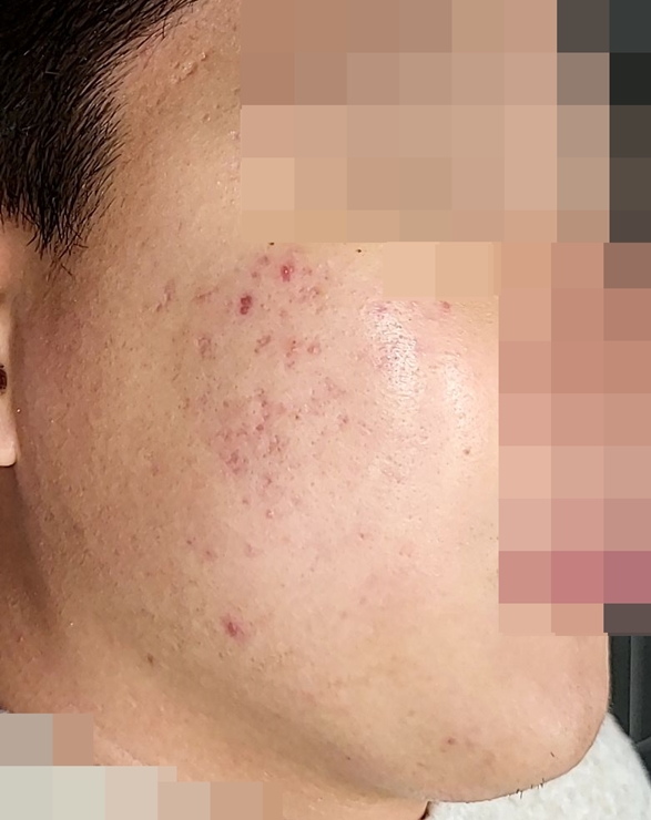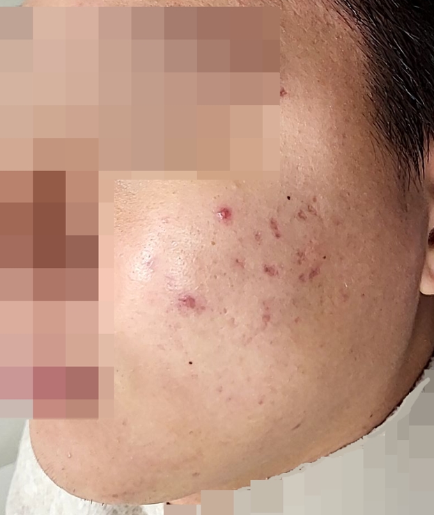검붉은 여드름자국 및 얕은 패인흉터 치료 사진입니다.