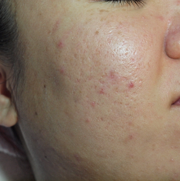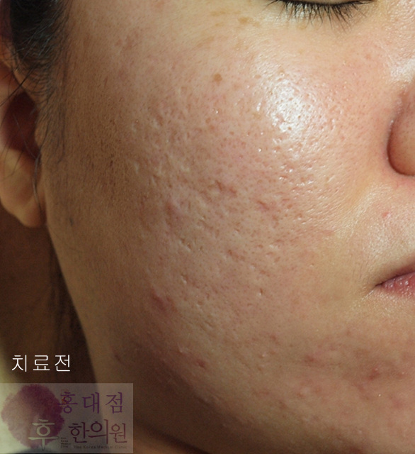 박스카 위주의 여드름 흉터가 많으며, 피지 분비가 현재까지도 왕성해 여드름이 계속 나고 있는 상태로 내원.