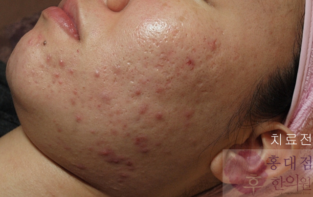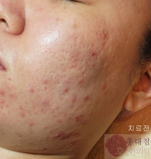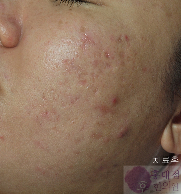 박스카 모양의 흉터들이 제법 많이 차올랐을 뿐 아니라, 기존의 여드름도 많이 완화된 모습을 보인다.