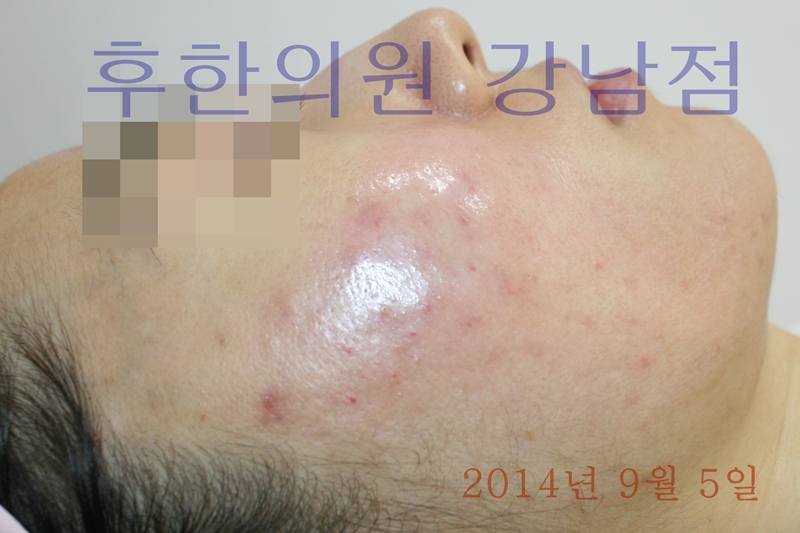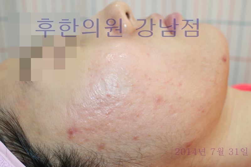 ![]() ![]() ![]() ![]() 피비테라피 치료 케이스1 상기 환자는 레이져 박피와 다양한 시술을 통해 여드름 흉터를 치료해왔다. 일정 이상 호전된 뒤에 더 이상 치료 진전이 없어 강남점에 내원하셔 흉터치료를 시작하였다. 1.피부의 특성 레이저 박피로 인하여 정상조직과 흉터간의 높이는 줄었으나 사진에서와 같이 일정 구역에 피부가 손상되어 손상된 피부중에 흉터 부분은 정상적인 피부조직이 남아 있지 않고 일부 강하게 치료 받은 조직은 피지가 낀것 처럼 모공이 기둥처럼 남아 있다. 2. 치료계획 피비 테라피를 하고 난 뒤에 트랜스테라피를 하고자 하였으나 화장을 지우고 본 결과 너무 피부가 심하게 손상되어 피비를 아주 강하게 치료하기로 바꾸었다. 3.치료과정 피비 치료를 아주강하게 들어가서 시술 후 듀오덤을 막 떼었을때가 보통은 제일 좋아져보이는데 이 경우에는 그렇게 좋지 않고 붉은 색이 심하였다. 귀약침으로 부족하여 귀약침과 브이셀로 13회 치료 4.결과 정상적인 피부조직이 남아있지 않은 공간에 차오르는 현상이 나타나면서 피부결이 매끄럽게 변하였다. 피부의 손상이 심하기 때문에 피부의 보습과 영양에 따라 약간의 변화가 예상된다. 1년뒤에 피부 상태를 보고 추가시술을 판단예정 |