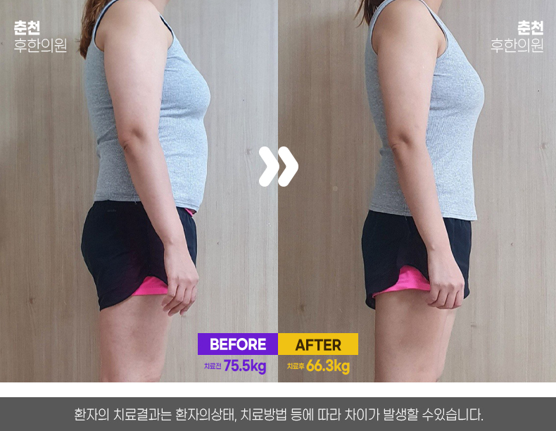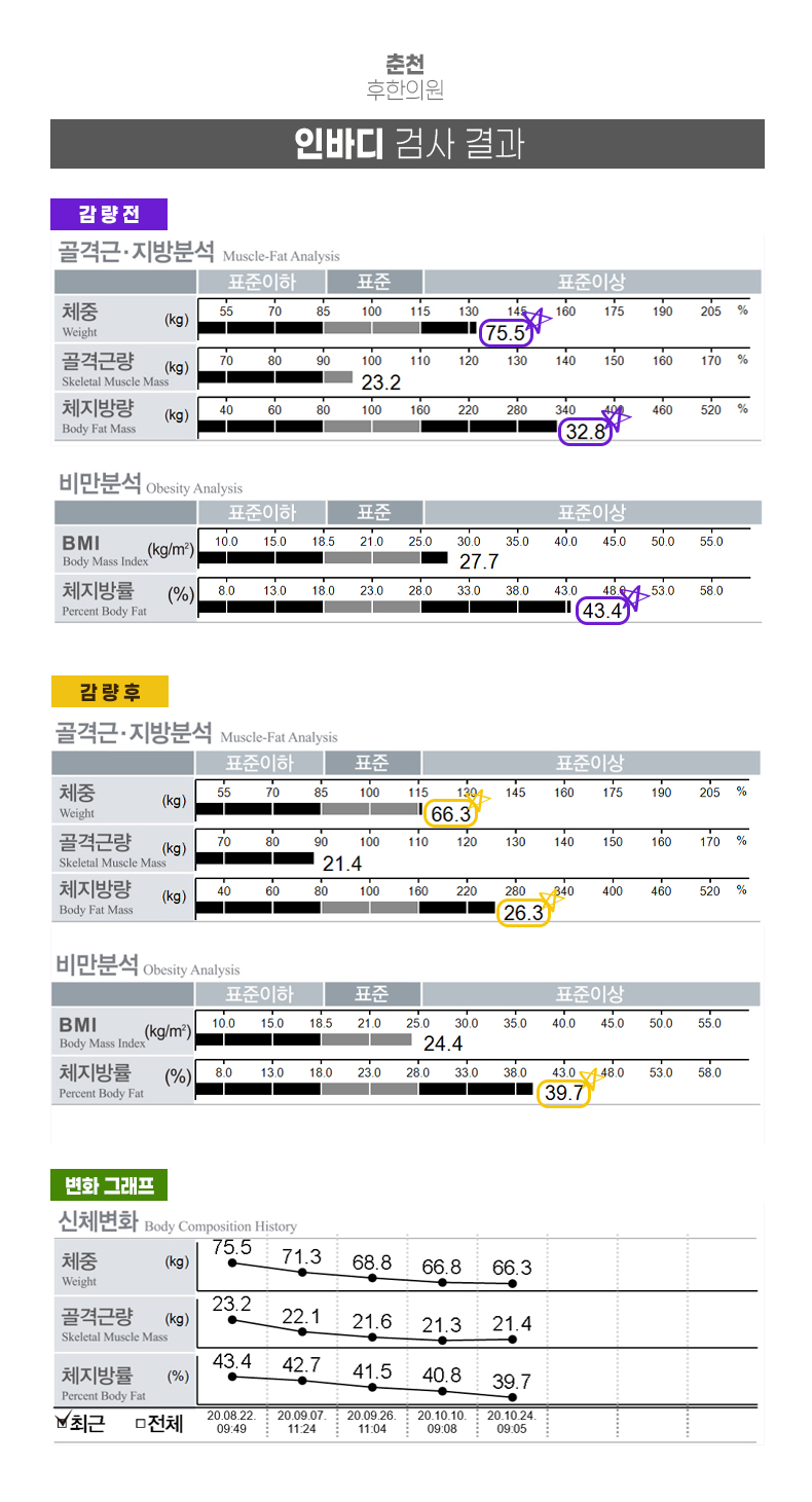 2개월 비움탕, 미감탕 복용으로 체중 9.2kg 감량 [75.5 -> 66.3] 체지방량 6.5kg 감량 [32.8 -> 26.3] 체지방률 3.7% 감소 [43.4 -> 39.7]