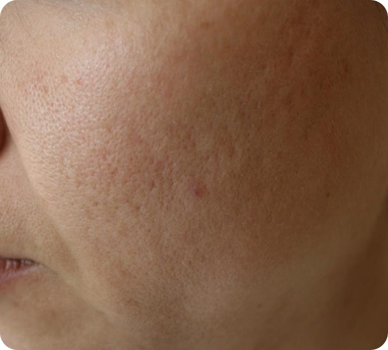 아이스픽 형 흉터 TYPE 2) 모공이 벌어지고 피부 두께가 비후된 아이스픽형 흉터 또는 큰 모공성 흉터