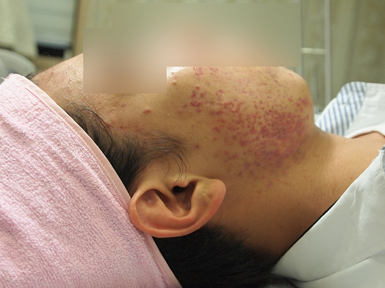여드름은 거의 치료가 되었으면 붉은 자국과 흉터는 아직 좀더 개선이 필요한 상태입니다.