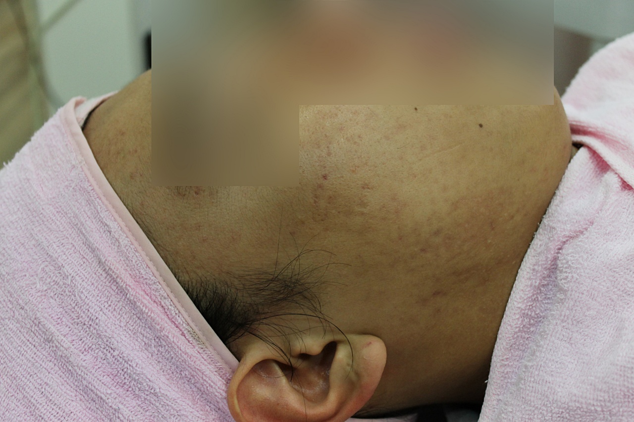 10대 후반 남자로 피부조직이 정상적으로 재생되기도 전에 같은 자리에 화농성 여드름이 계속 반복되어 피부가 재생되지 않음으로 색소성 붉은자국 및 함몰성흉터까지 동시에 심해진 케이스입니다.