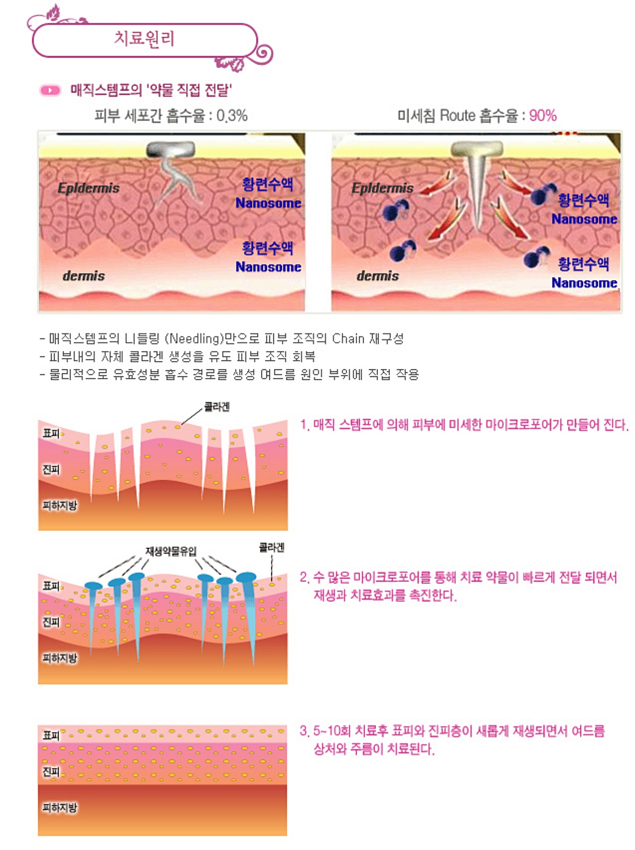엠톤(오토매직스탬프, AMS)의 치료 원리를 설명드리자면 도장침을 이용하여 피부에 물리적인 상처(마이크로 멀티홀)를 만들고, 바로 이 홀을 통하여 피부장벽에 의해 흡수되기 어려운 물질들을 흡수시킵니다.