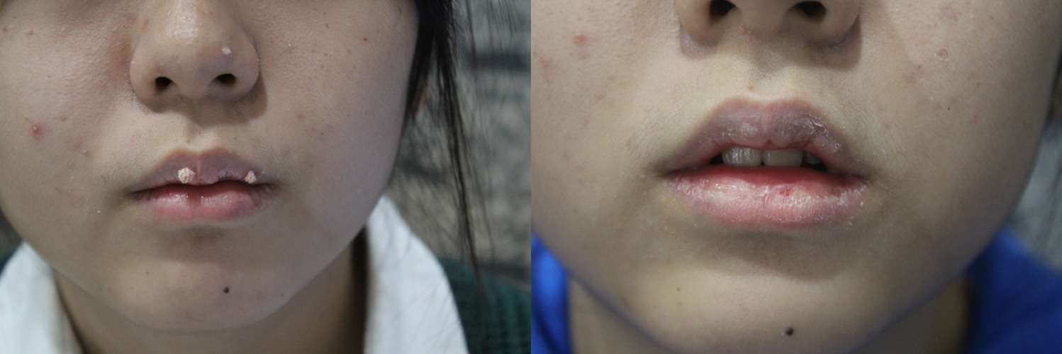 손가락 끝의 상처 부위를 통해 바이러스가 반복적으로 침투하면서, 손톱 주변에 사마귀가 생겼고 이후 손을 입에 대는 습관으로 인해 입술 부위까지 사마귀가 번진 케이스였습니다.