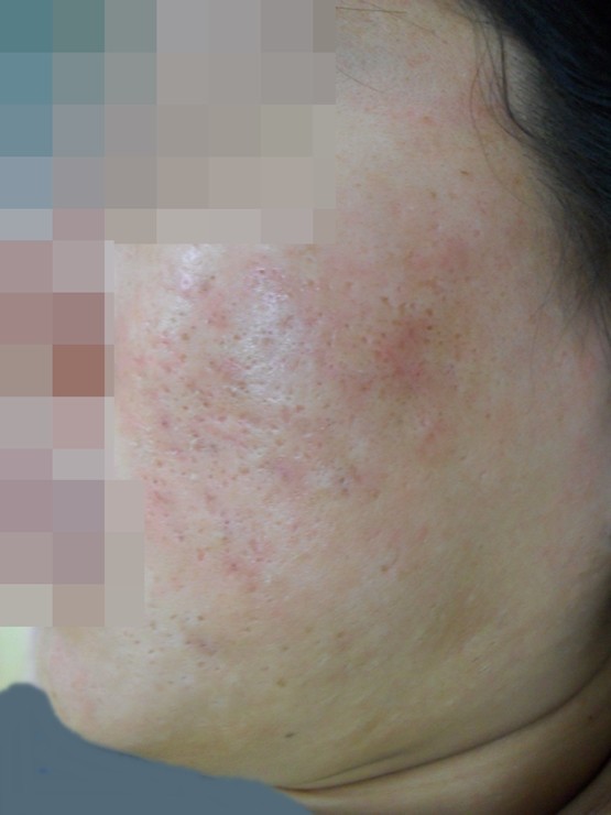 양볼에 생긴 패인 흉터 치료사진입니다.