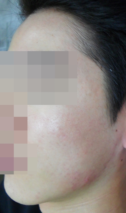 양볼에 생긴 패인 흉터 치료사진입니다.