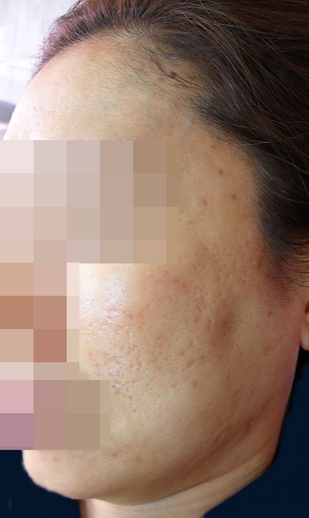 양볼에 생긴 패인 흉터 치료 사진입니다.