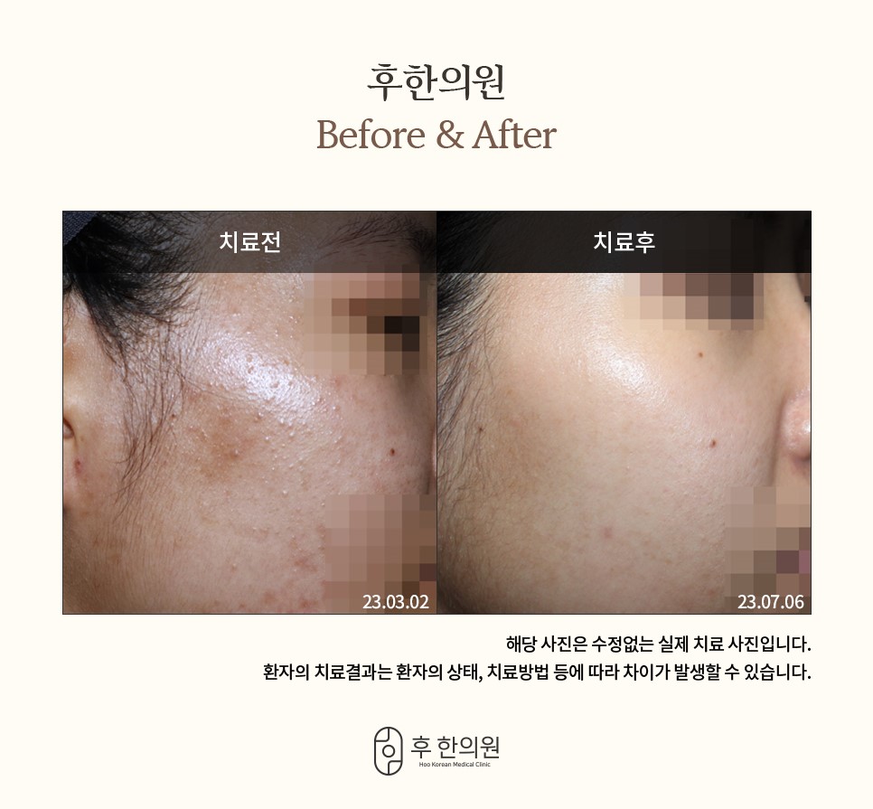 춘천 후한의원 여드름 치료 4개월 전후 한약 2개월, 케어 8회, 시술 5회 진행 한약 치료를 통해 염증과 피부열을 낮춰주면서 케어와 시술로 여드름 및 붉고 거뭇거뭇한 여드름 자국 치료 의료진의 섬세한 진료와 진중한 치료를 확인해보세요!