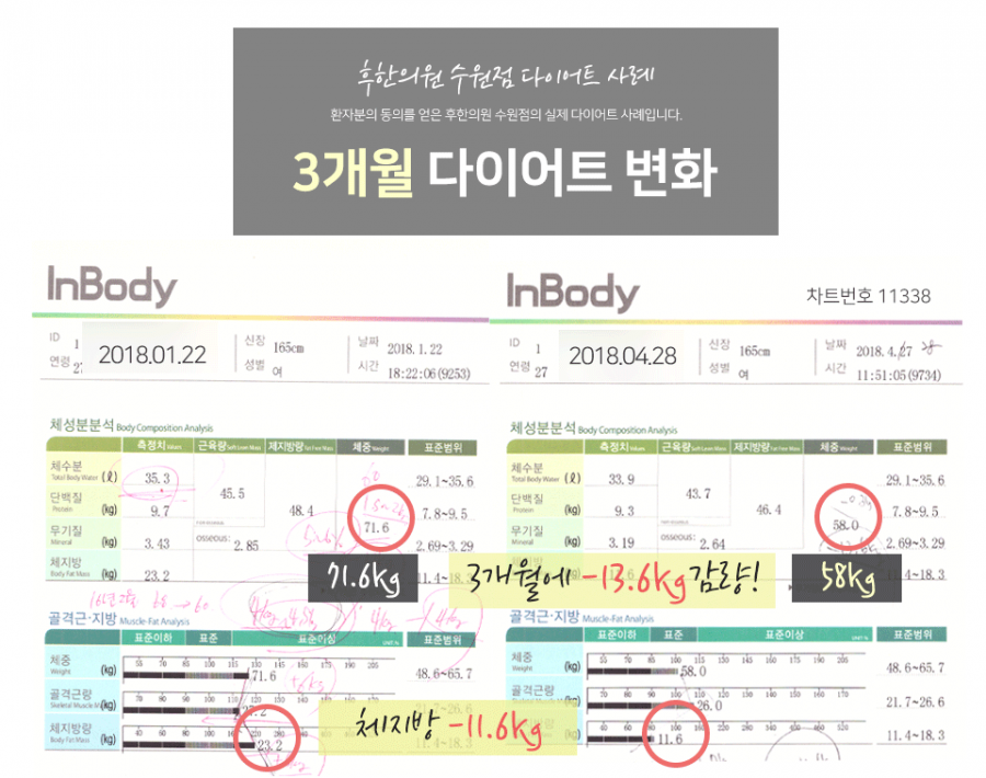 치료 전 71.6kg 치료 후 58kg 총 -13.6kg 체지방 -11.6kg 감량 특징: 20대 여성, 평소 생리통 심한편, 수족냉증, 몸이 잘 붓고 무거운 체질, 한약다이어트 처음