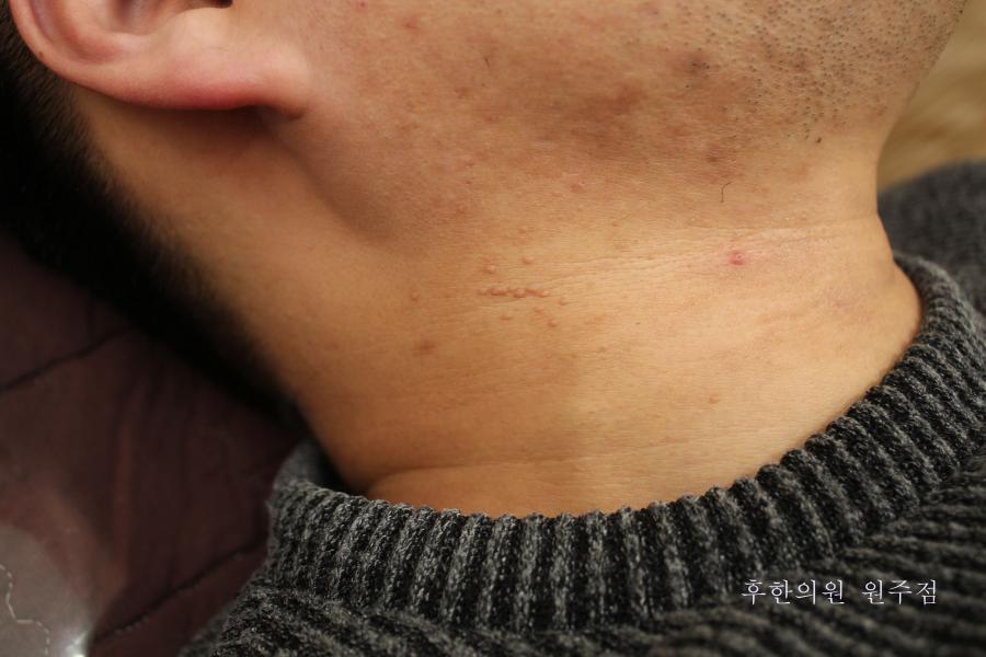 2개월 탕약과 약침 만으로 얼굴(이마,볼,관자놀이)과 목부위의 편평사마귀가 모두 제거된 케이스.