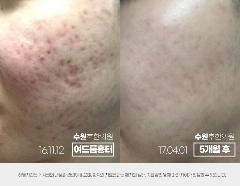 후한의원 수원점 여드름흉터 5개월 과정 변화 특징: 심한 염증으로 곰보자국 발생 아크네케어,PDT, 엠톤, 약초침, 한약, 홈케어 진행