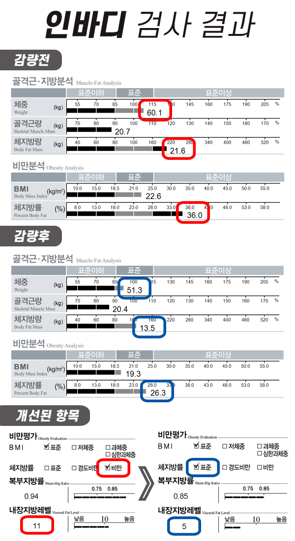 한방 다이어트로 특히 복부지방을 많이 감량하셔서 체지방률도 비만에서 표준으로! 내장지방레벨도 11에서 5로 낮아졌습니다.